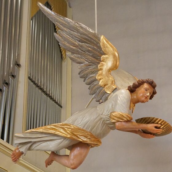 Schild am Eingang zur Bonifatiuskirche - Foto:... Kirchentür der Bonifatiuskirche - Foto: A. Füser Blick auf die Bonifatiuskirche - Foto: A. Füser Eingang zum Pfarramt - Foto: A. Füser Taufengel in der Bonifatiuskirche - Foto: A. Füser