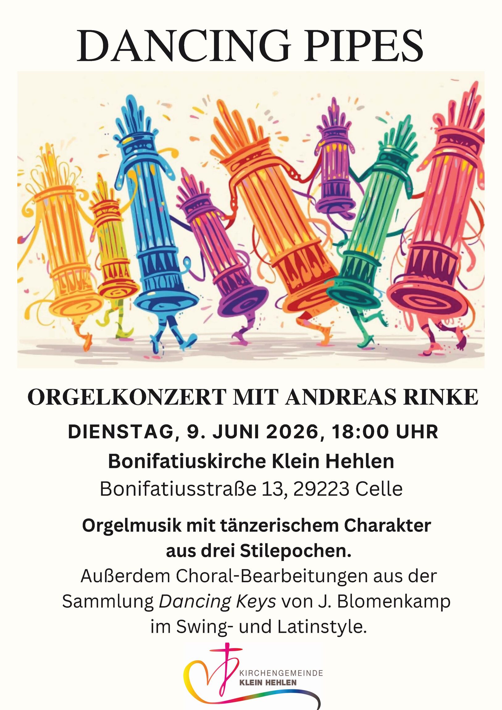 Am Dienstag, den 9. Juni 18:00 Uhr, erwartet uns in der Bonifatiuskirche ein besonderes Orgelkonzert! Es werden Orgelkompositionen aus fünf Jahrhunderten beinhalten, die in ihrem Charakter tänzerisch angelegt sind. „Dancing Pipes“ lautet daher der Titel des Konzertes mit Andreas Rinke.